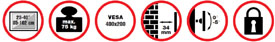 Tekniske data: Tilt: +/- 5° Rotation: 0° Kapacitet: 75kg / 23-40" / 85-102cm Vesa: Max. 400x200 Montage: Væg Farve: SølvTyverisikring